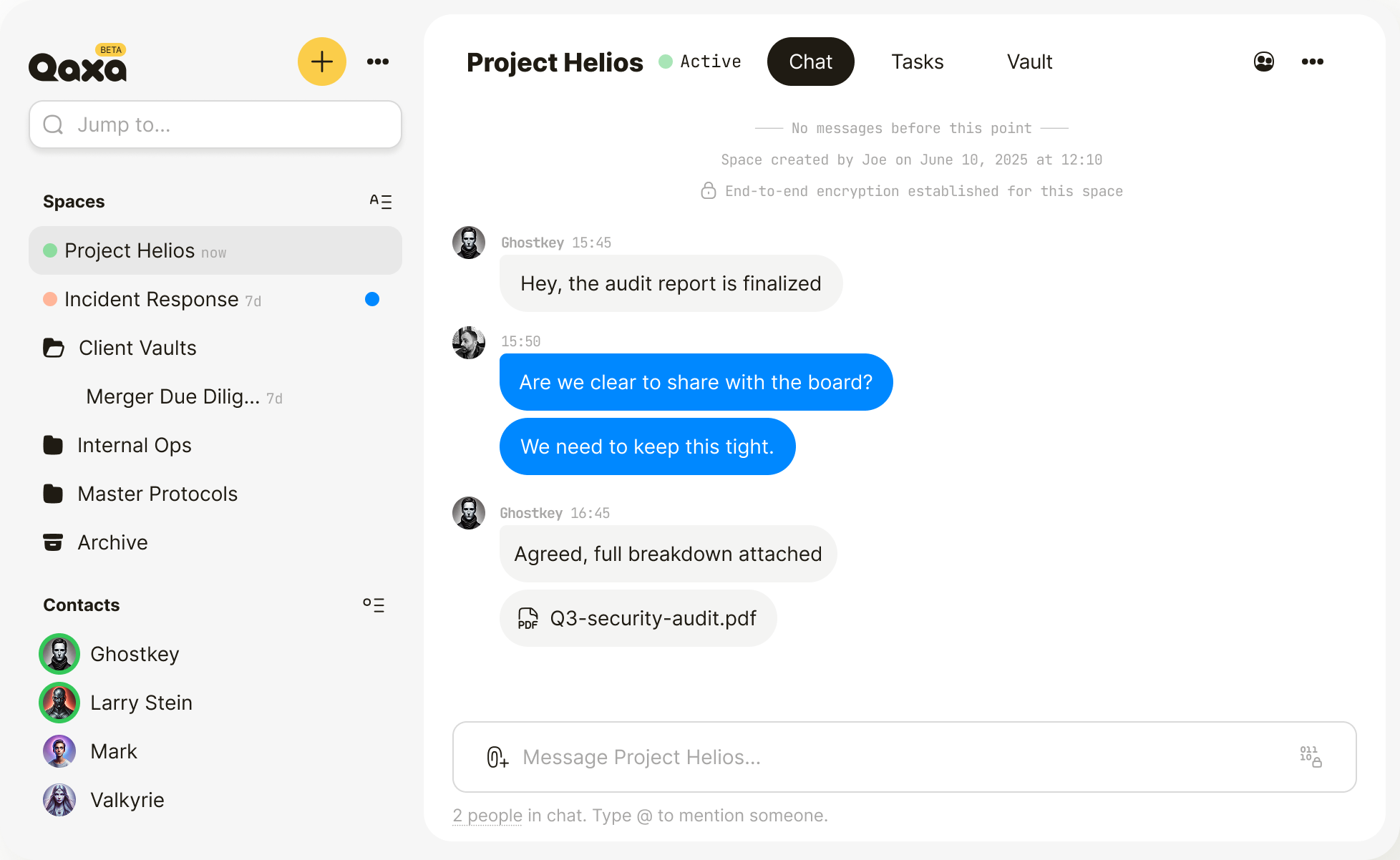Yes. Exactly like your messages. All files are encrypted end-to-end on your device before they are ever uploaded. They can only be decrypted by the people in your Space. We don’t use third-party processors or external clouds—your files stay private, encrypted, and stored strictly on Qaxa servers.