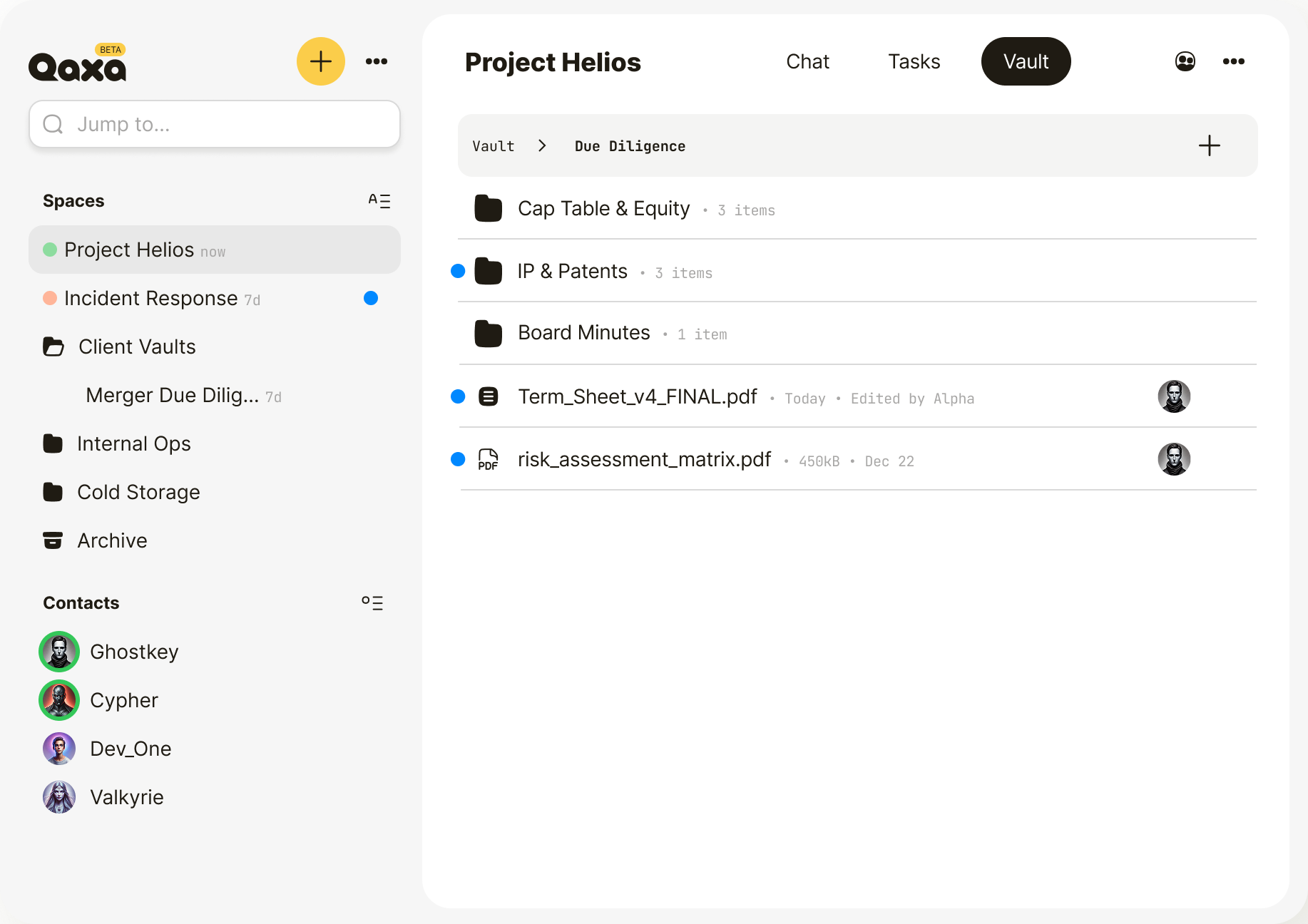 Your chats, tasks, notes, and files are end-to-end encrypted on your device. Qaxa never gets your keys — so we can’t read your content.